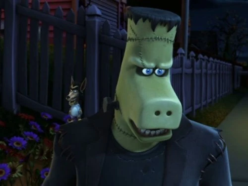 Meanwhile, in the cemetery, Snotty Boy finds Hockey Mask Bob's tree trunk full of candy. He eats a piece even though his friends warn him not to. Hockey Mask Bob comes up behind him scaring his friends away but Snotty Boy doesn't notice until he hears him breathing. He turns around and runs out of the cemetery, crashing into many tombstones on the way out. But it was really just Otis pretending to be Hockey Mask Bob. Everyone comes out laughing and then Abby asks Otis if they can leave and Otis says they can after he takes a handful of candy from the tree. Everyone tries to talk him out him out of it but he takes it anyway. The hockey mask is left on the ground but is stepped on by Hockey Mask Bob who follows them out of the cemetery. Meanwhile in the zucchini field, Freddy tells Peck how excited he is and that the Great Zucchini's candy must be pretty good if they skipped trick or treating for it. Peck then tells Freddy the Great Zucchini brings office supplies, not candy. Freddy replies by saying "Wow that's even better. What!?" Peck then sees what he thought was the Great Zucchini but is really Hockey Mask Bob. When they realize this, they both scream. Back at the barn, they are having a Halloween party and Otis is counting his candy. He then calls everyone lemon sucking cowards for being scared of Hockey Mask Bob. After Abby goes down to the basement to grab more soda, the power goes out. Abby shrieks in the basement whenever Otis talks to her. He doesn't consider them shrieks until Duke tells him. Everyone except Otis thinks it Hockey Mask Bob. Otis tries to open the door but it's locked. Pig then gets pulled into the basement. Otis finally realizes it is Hockey Mask Bob and panics.