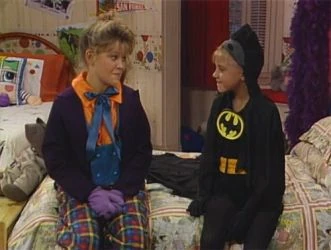 It becomes even more serious when Becky shows up with the Wake Up, San Francisco crew to tape the race, meaning that the whole city is anxiously awaiting the outcome. Danny wins – literally by a nose. Danny has Jesse and Joey wear Raggedy Ann and Andy costumes to the party, with Stephanie attending as Batman, D.J. attending as The Joker (complete with mask, which she removes prior to her heart-to-heart with Stephanie, see below), and Michelle as a black cat.
