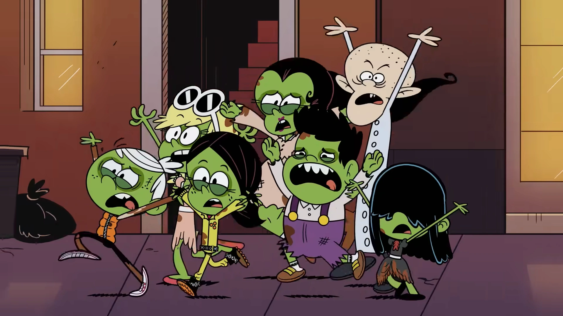 Carl, Bobby, and Hector drive around in the mercado van, capturing as many zombies as they can. However, just when they think they've got them all, one particularly muscular zombie pushes them out of the way and steals the van. Meanwhile, Lincoln, Leni, Lucy, Boris, Ronnie Anne, Carlota, and CJ have been trick-or-treating when they suddenly encounter the zombies themselves. After fleeing in terror from the zombies, the trick-or-treaters bump into Carl, Bobby, and Hector. Upon hearing Lincoln mention the zombies, Carl has no choice but to confess that he used Lucy's spell book (Boris: "You should really put a lock on that"). Lucy figures that there's one way they can regather all the zombies - have them come after the two biggest brains in the city.