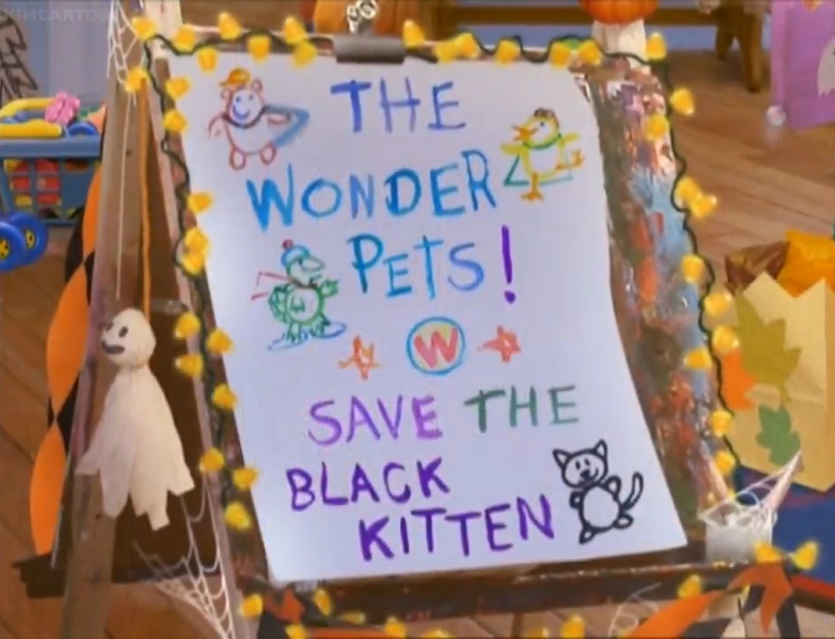 On Halloween, the Wonder Pets, dressed for trick-or-treating, get a call and head into town to help a black kitten who is trapped inside a haunted dog house.