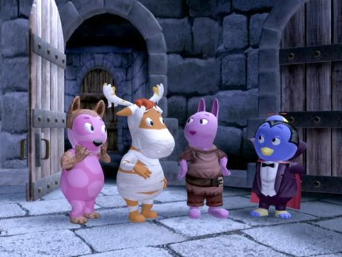 Next, the two head for the forest to pick up a werewolf. After a run-in with a grabbing tree, they find and meet Werewolf Uniqua, who's just as scared of them as Mummy King Tyrone is. After the two monsters realize that there's nothing to be afraid of, Austin gives her one of the secret letters/invitations. And so, the three of them make their way to the castle of the local vampire, to the displeasure of Tyrone and Uniqua. When they make it to the tower where the vampire is, he is just as scared of them as Tyrone and Uniqua are of him and each other. But once they get themselves together, they realize their each more friendly than scary.