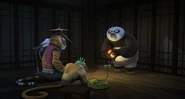 When Po finishes, Tigress admits that his story was terrifying - if she was four! The others tease Po for being scared of hopping ghosts, which he indignantly denies - and nearly jumps out of his skin when Shifu speaks behind him. Shifu says that a request has come in, asking that they check out a report of strange goings-on outside the village. The Five insist that Po should go with Shifu, to the panda's dismay, but he can't refuse.