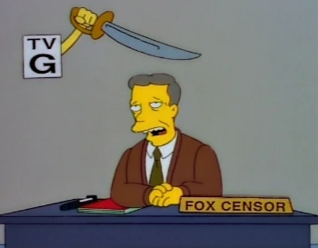 In the response to the TV Parental Guidelines implanted at the very beginning of the year. A Fox censor simply named Fox Censor, sitting at his desk reading through the script and deleting things, proudly announces that thanks to his editing tonight's Simpsons episode is rated TV-G. But as he says this, a hand with a sword appears out of the on-screen rating icon and stabs him in the back repeatedly. Every time he gets stabbed, the rating gets higher. In the end, the rating is "TV-666" and Censor collapses dead onto the desk. Blood pours down the front to reveal the title, "The Simpsons Halloween Special VIII."